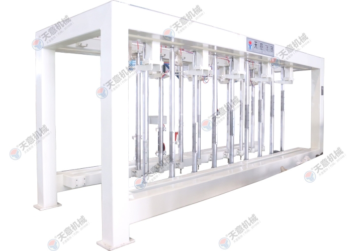 脫模后的坯體連同側板一起放置在切割小車上,切割小車由減速電機驅動行走,通過縱向切割機完成縱向切割,切割小車繼續(xù)行走至橫向 切割機中間位置停止后,由小車置換裝置將側板連同坯體抬起,切割小車退回翻轉行車底下進行下一次承載脫模后的坯體,另外一部切割小車 進入置換裝置底下后, 置換裝置將側板連同坯體放置該切割小車上后,橫向切割動作后啟動進行橫向切割動作,切割完成后,切割小車再行走至確地行車底下,再由 翻轉去底行車將坯體去底(連側板)吊至蒸養(yǎng)小車上,切割小車范圍原始位置進行下一個切割循環(huán)。