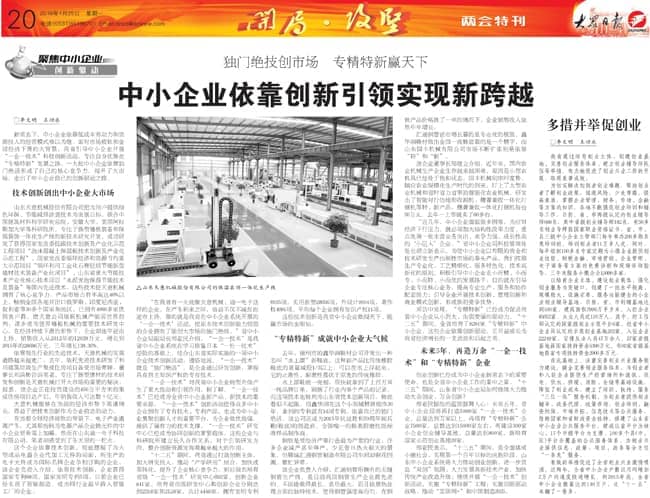 2015年1月25日的大眾日報?兩會特刊《獨門絕技創(chuàng)市場 專精特新贏天下――中小企業(yè)依靠創(chuàng)新引領(lǐng)實現(xiàn)新跨越》重點介紹了我公司技術(shù)創(chuàng)新的經(jīng)驗,敬請關(guān)注。