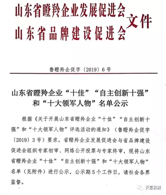 根據(jù)《關(guān)于開展山東省瞪羚企業(yè)“十佳”“自主創(chuàng)新十強”和“十大領(lǐng)軍人物”評選活動的通知》(魯?shù)闪缙蟠僮帧?/span>2019〕3號)要求,2019年12月6日,山東省瞪羚企業(yè)發(fā)展促進會、山東省品牌建設(shè)促進會發(fā)布魯?shù)闪缙蟠僮?/span>[2019]6號文,公布經(jīng)過專家初審、網(wǎng)絡(luò)公開投票與專家終審,評選出了山東省瞪羚企業(yè)“十佳”、“自主創(chuàng)新十強”和“十大領(lǐng)軍人物”。天意機械榮獲“山東省十佳瞪羚企業(yè)”稱號。