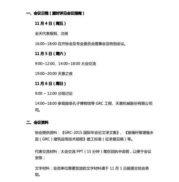 2014 年南京年會以來的新技術(shù)、新材料和新裝備成果;展示上海迪士尼GRC 典型示范工程風(fēng)采;研討 GRC 技術(shù)與產(chǎn)品研發(fā)方向;匯報 2015 年迪拜國際 GRC 年會及國際 GRC 發(fā)展方向;介紹《玻璃纖維增強水泥(GRC)建筑應(yīng)用技術(shù)規(guī)程》建工標(biāo)準制定情況;觀摩曲阜孔子博物館等 GRC 工程。為滿足與會者的要求,大會還將特邀相關(guān)部門專家作裝配式建筑發(fā)展導(dǎo)向性報告。